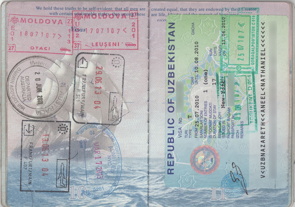 | Moldova Exit (Otaci) 18 Jul 2010 | Moldova Entry (Leuseni) 17 Jul 2010 | Uzbekistan Full Page Visa | Uzbekistan Entry (Qoraqalpg'iston) 25 Jul 2010 |